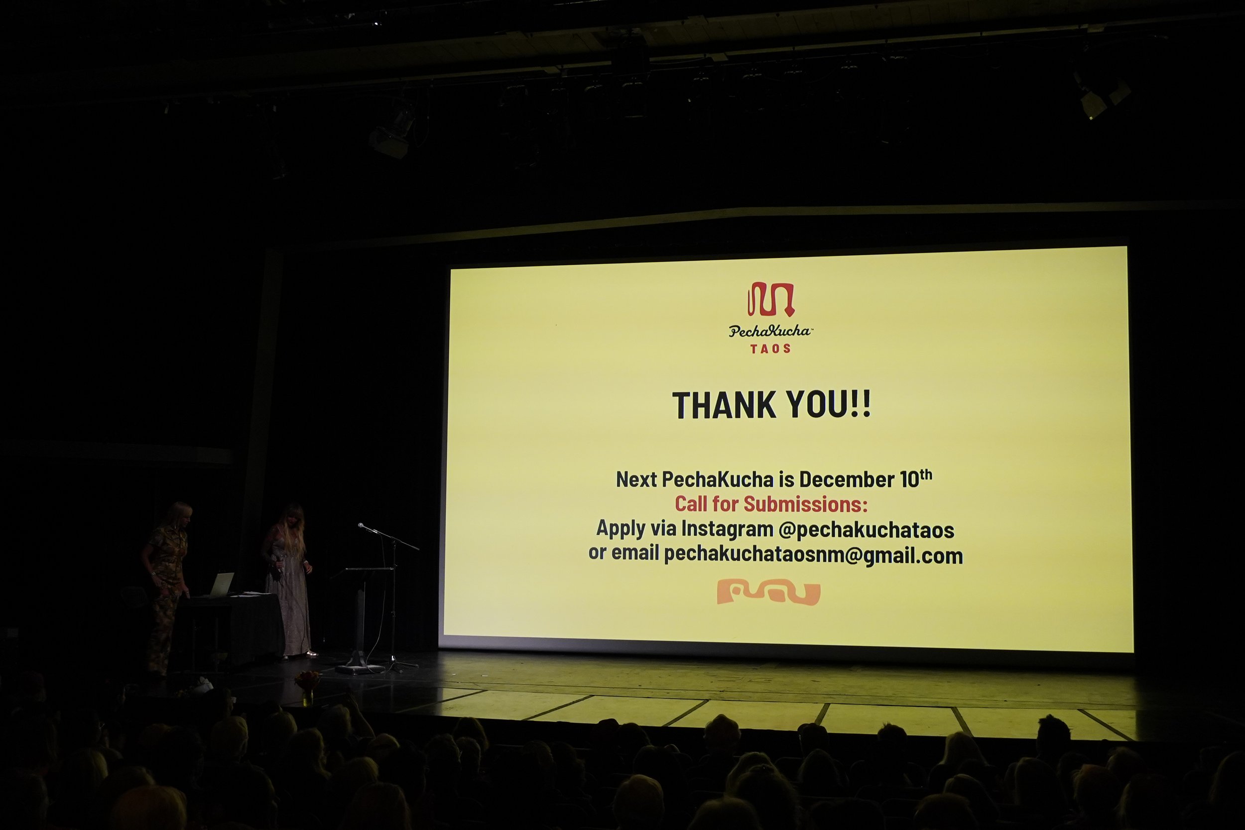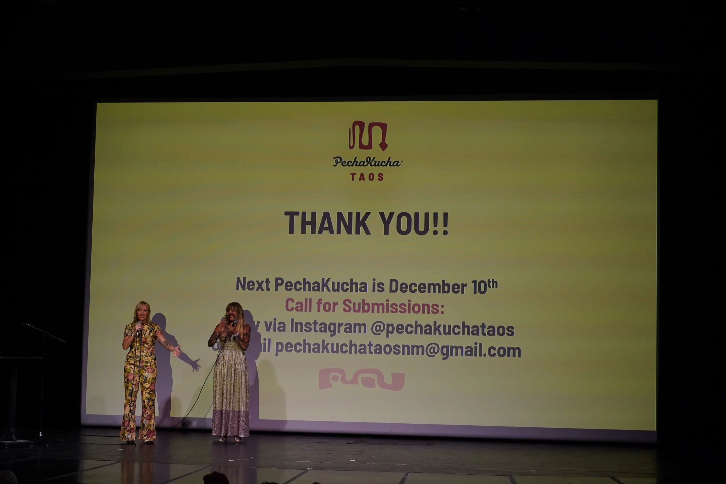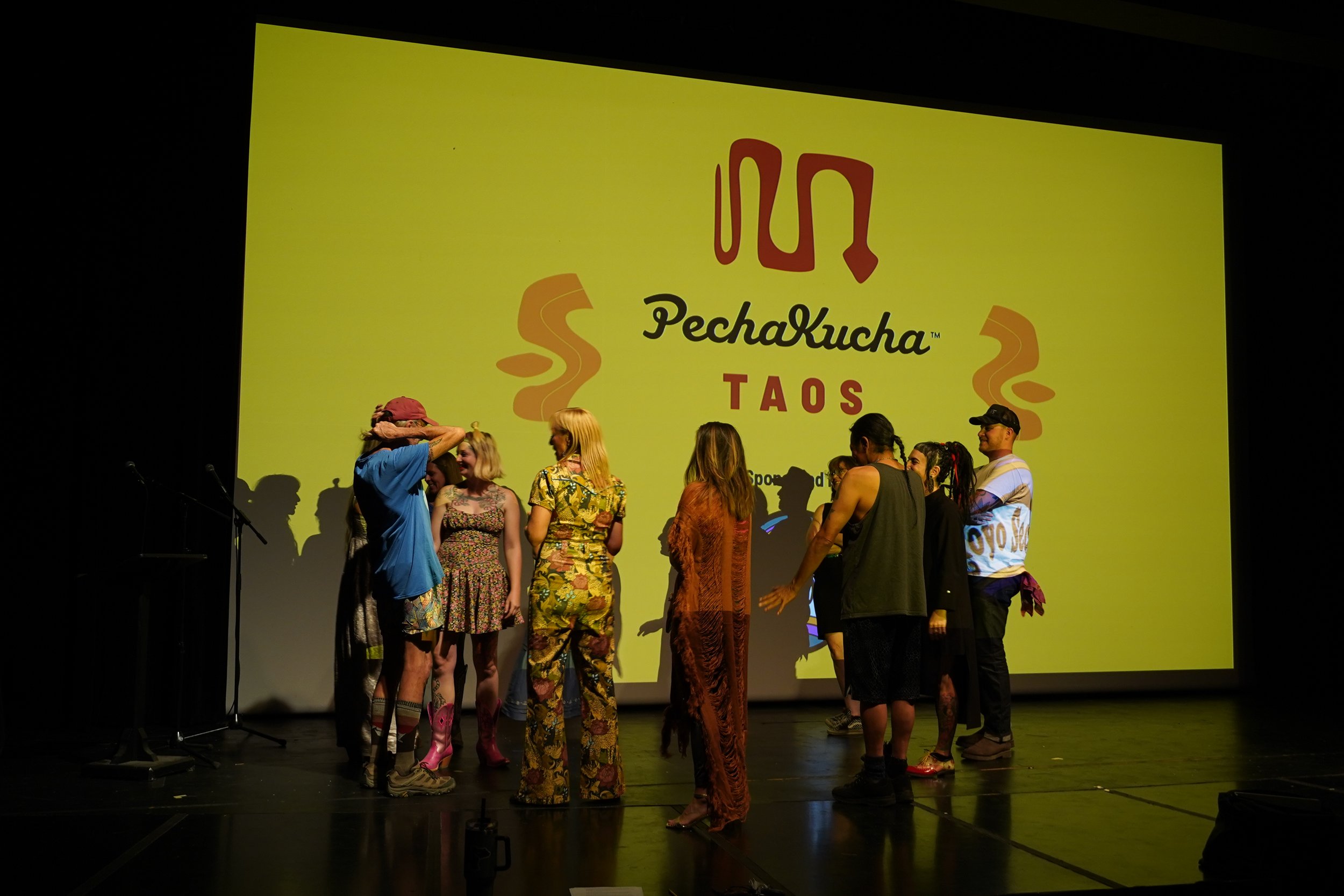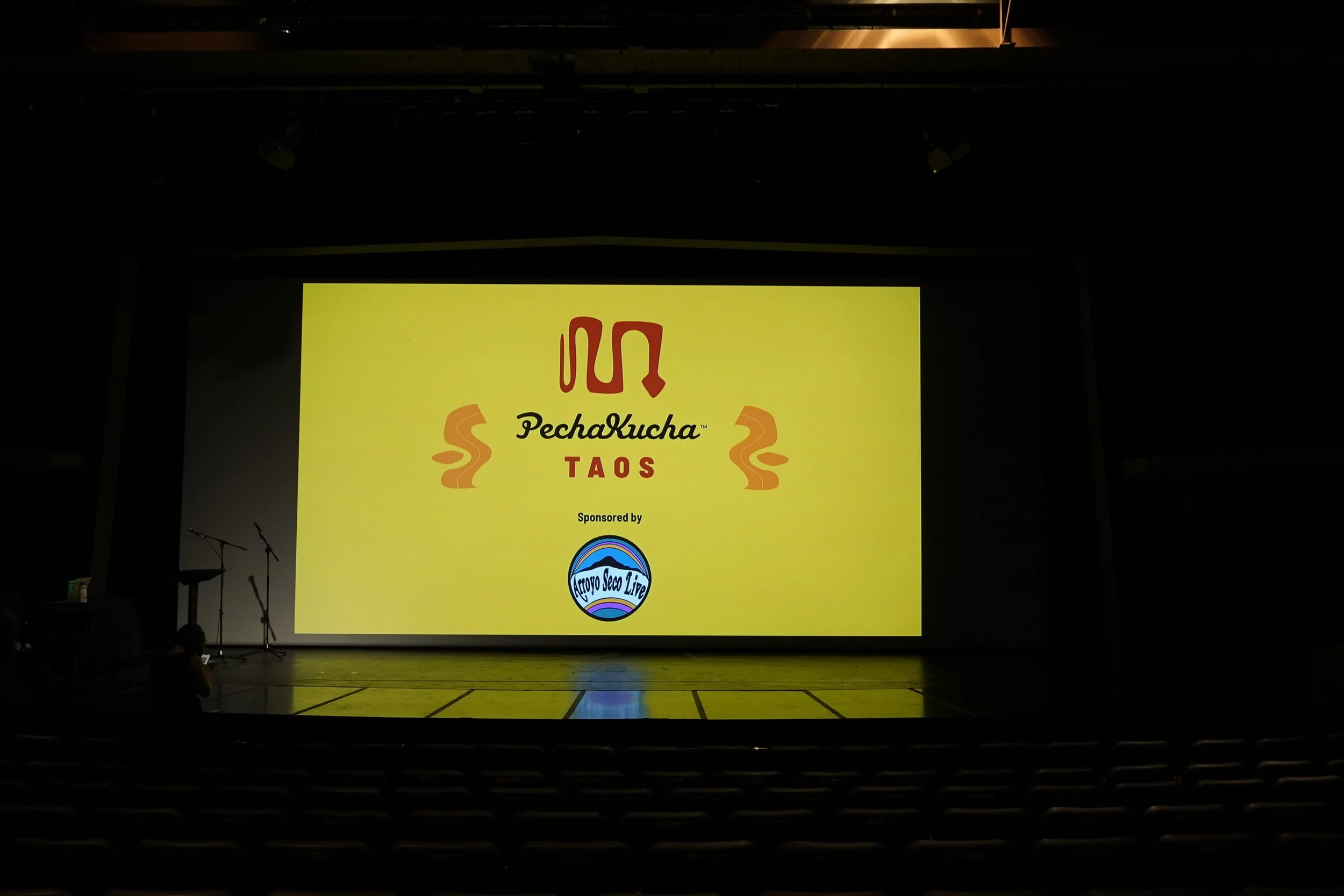 On Wednesday September 10, 2025, PechaKucha Taos made an incredible comeback after a four year pause at The Taos Center for the Arts. Co-heads Jay Vosper and Jessica Thomas, two Taos locals, set out to revive this global storytelling event with a couple of new twists including organizing a special musical guest and providing food as well as dessert from local businesses. Garry Blackchild brought the house down with country folk live music before the presentations and at intermission, Aceq Restaurant cooked up delicious tacos before the show, and A Salty Little Sweet Shop left zero cookie crumbs during intermission. Every presenter spoke from the heart and got a standing ovation including Price Valentine, David Vargo, Summer Duran, Lyle Wright, Julie Cloutman, Mira Betz, Nadine Lollino, Liz Van Voorhis, and Elija Safford. Thank you to all of our presenters and partners for making a memorable night happen. Thank you to Chris Thomas for the beautiful graphics. And a big thank you to Arroyo Seco Live, our generous sponsor for the event. Check out the live presentations on YouTube @pechakuchataos and save the date for the winter event on Wednesday 12/10 at the TCA.